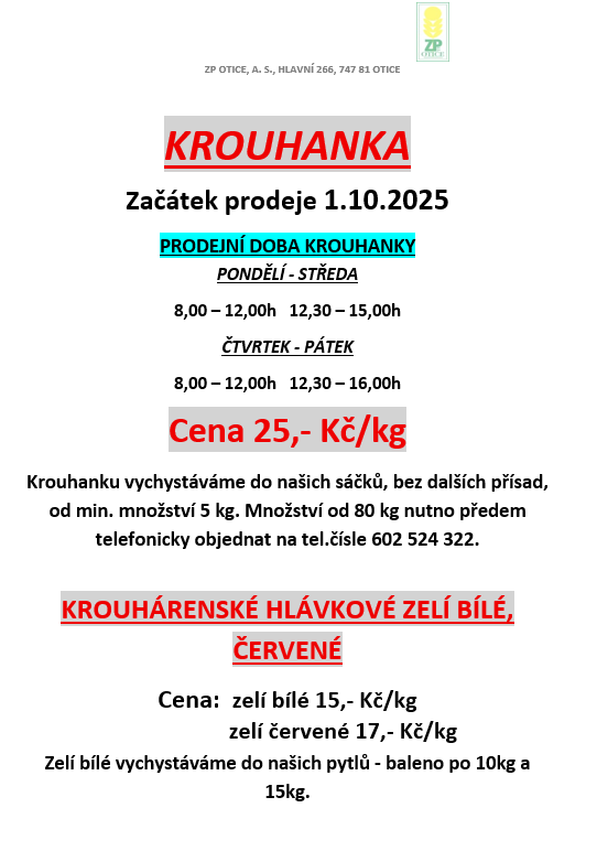 PRODEJ KROUHANKY A HLÁVKOVÉHO ZELÍ OD 01.10.2025. Více informací ZDE.